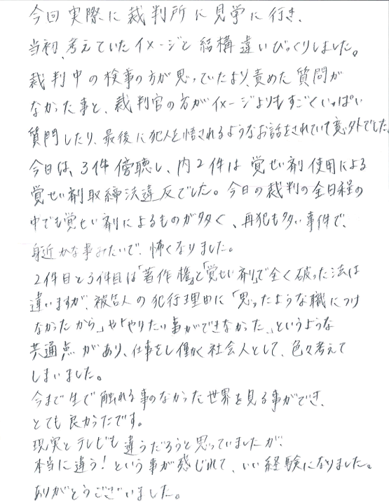 今日の裁判の全日程の中でも覚せい剤によるものが多く、再犯も多い事件で、身近な事みたいで、怖くなりました。