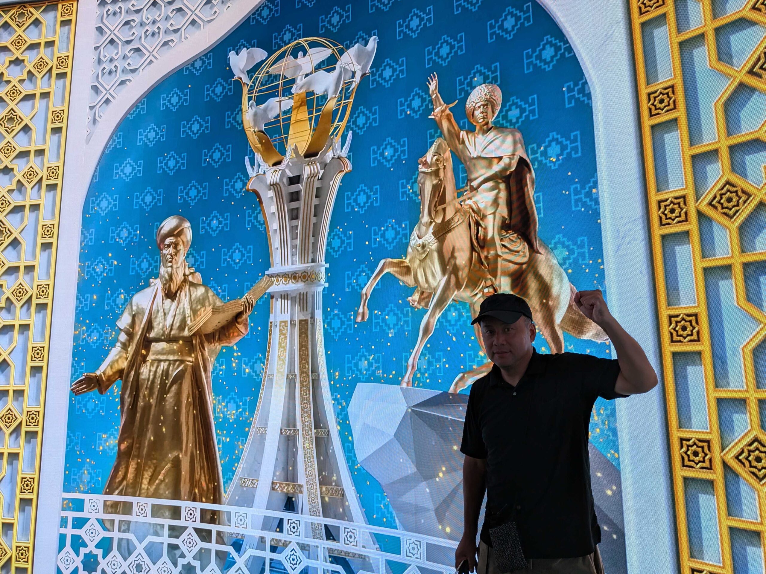 そして来ました入り口ですが、早速トルクメニスタンの国家元首、セルダル・ベルディムハメドフ大統領が大きな顔写真でお出迎えしてくれます。