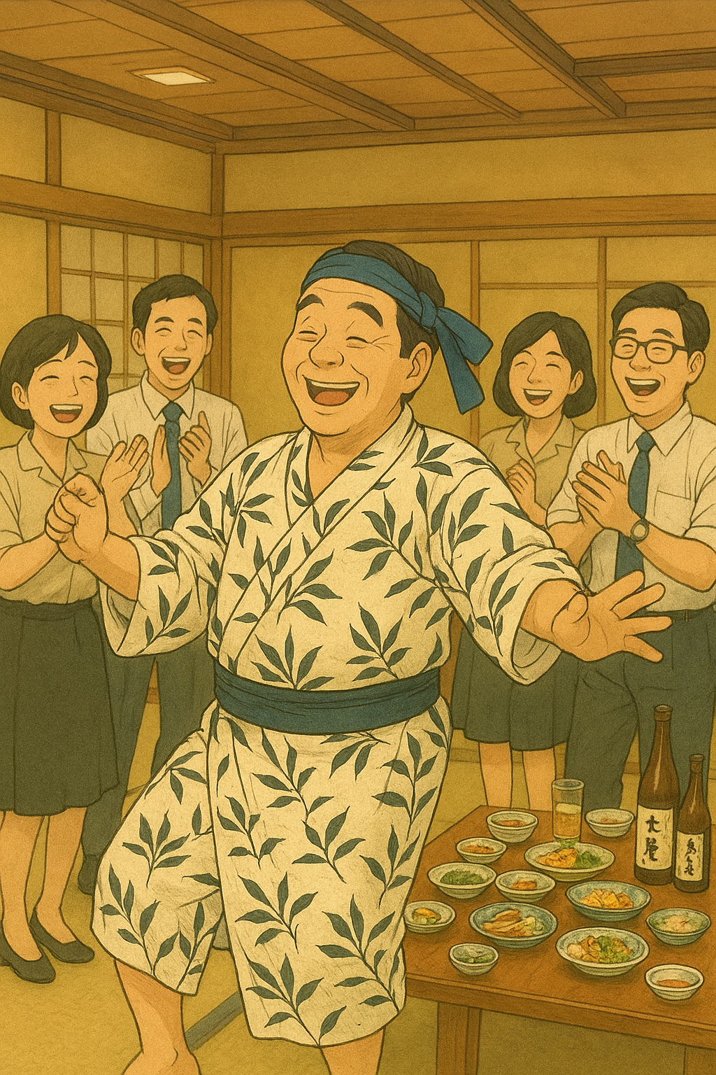 「昭和時代の楽しい社内旅行で、頭にネクタイ巻いて浴衣で踊ってる写真」AIイラスト