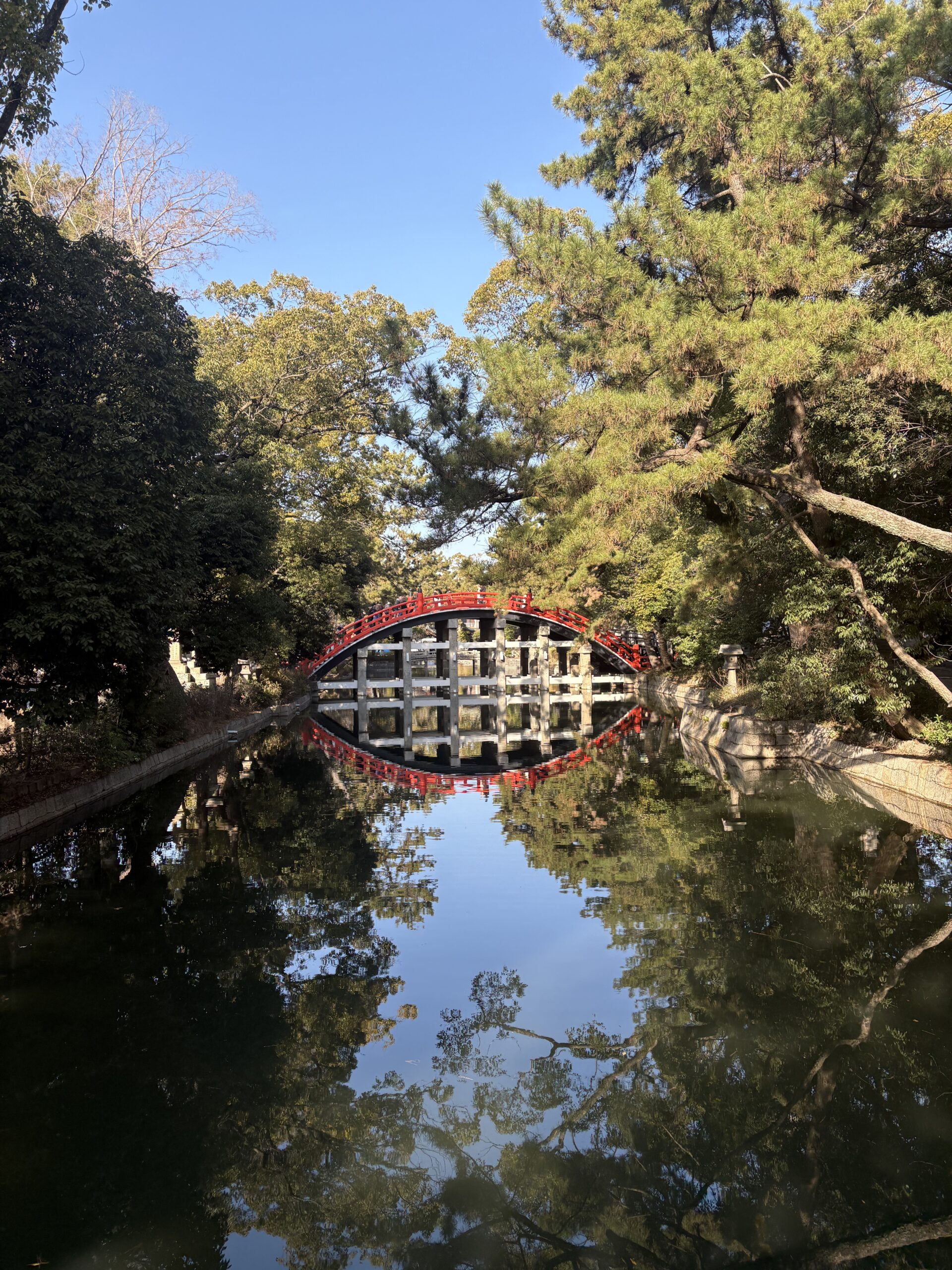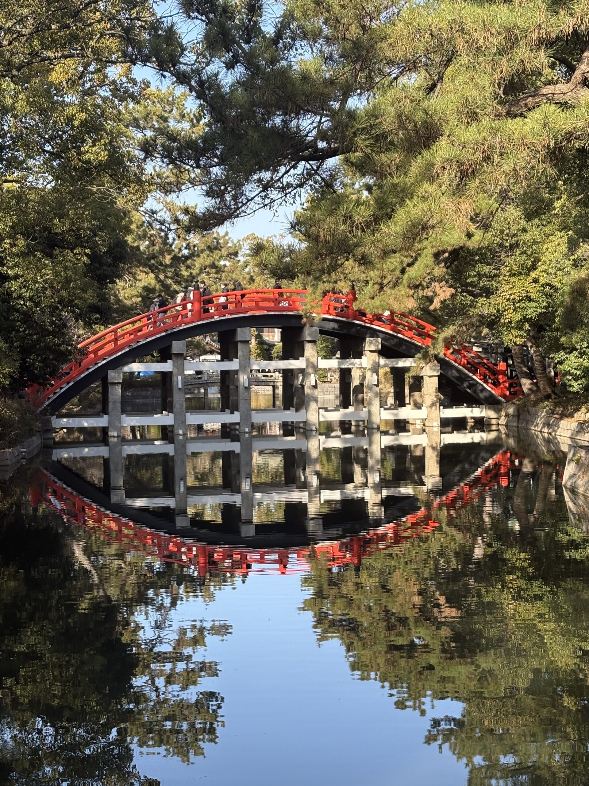 住吉大社さんの鮮やかな朱色の反橋ですが、橋の形と池の水面に反射した影を合わせると円形にみえることから太鼓橋と呼ばれます。